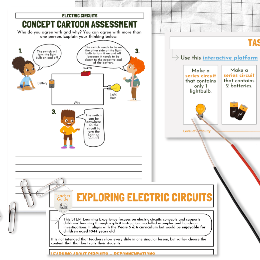 - Assessment tools, including two concept cartoons targeting common misconceptions around electrical circuits as well as suggestions about next steps for teaching following the assessment tasks.
