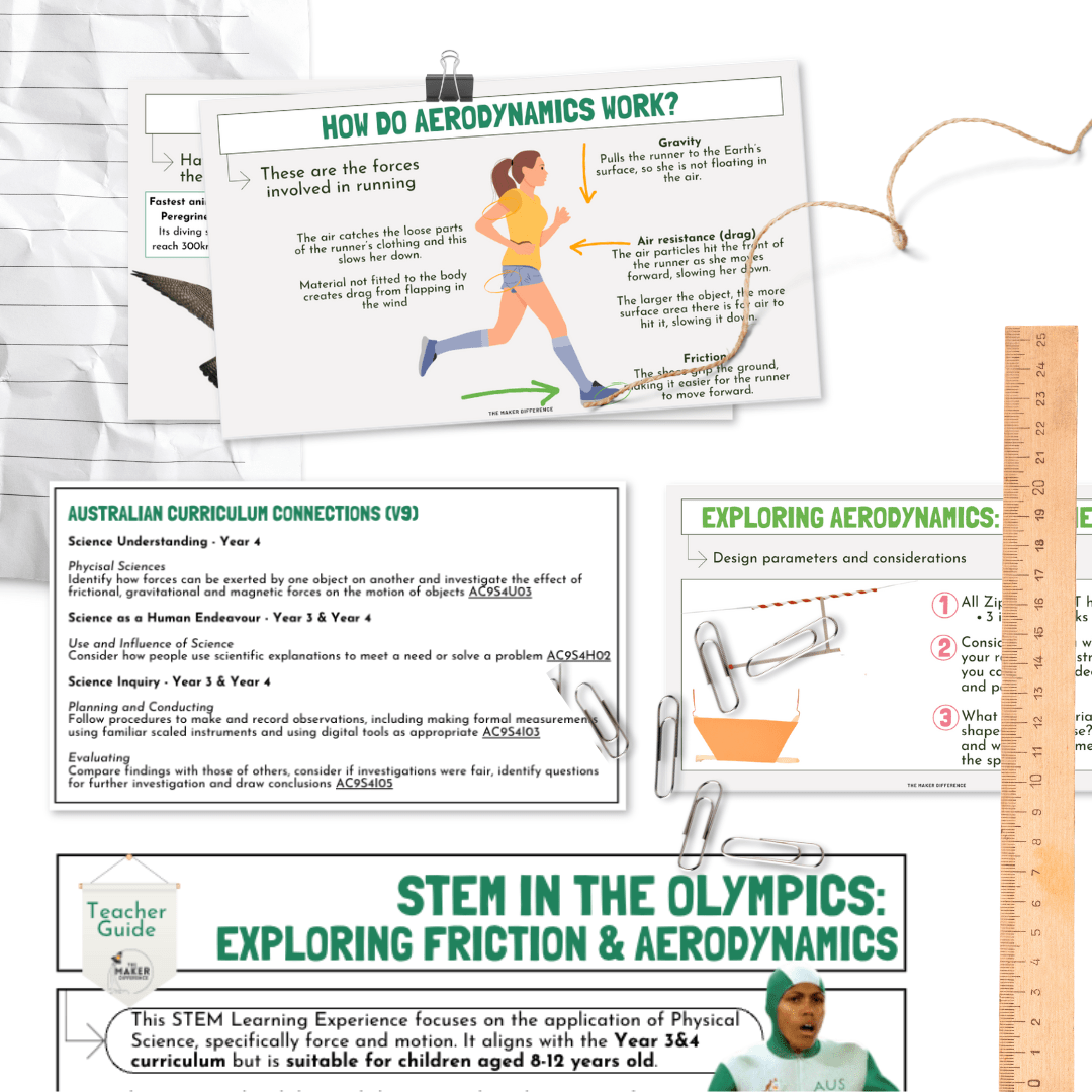 - Slides – an history of Olympics uniforms, followed by clear, annotated diagrams of Science concepts and the introduction to the aerodynamic zipline STEM Challenge.